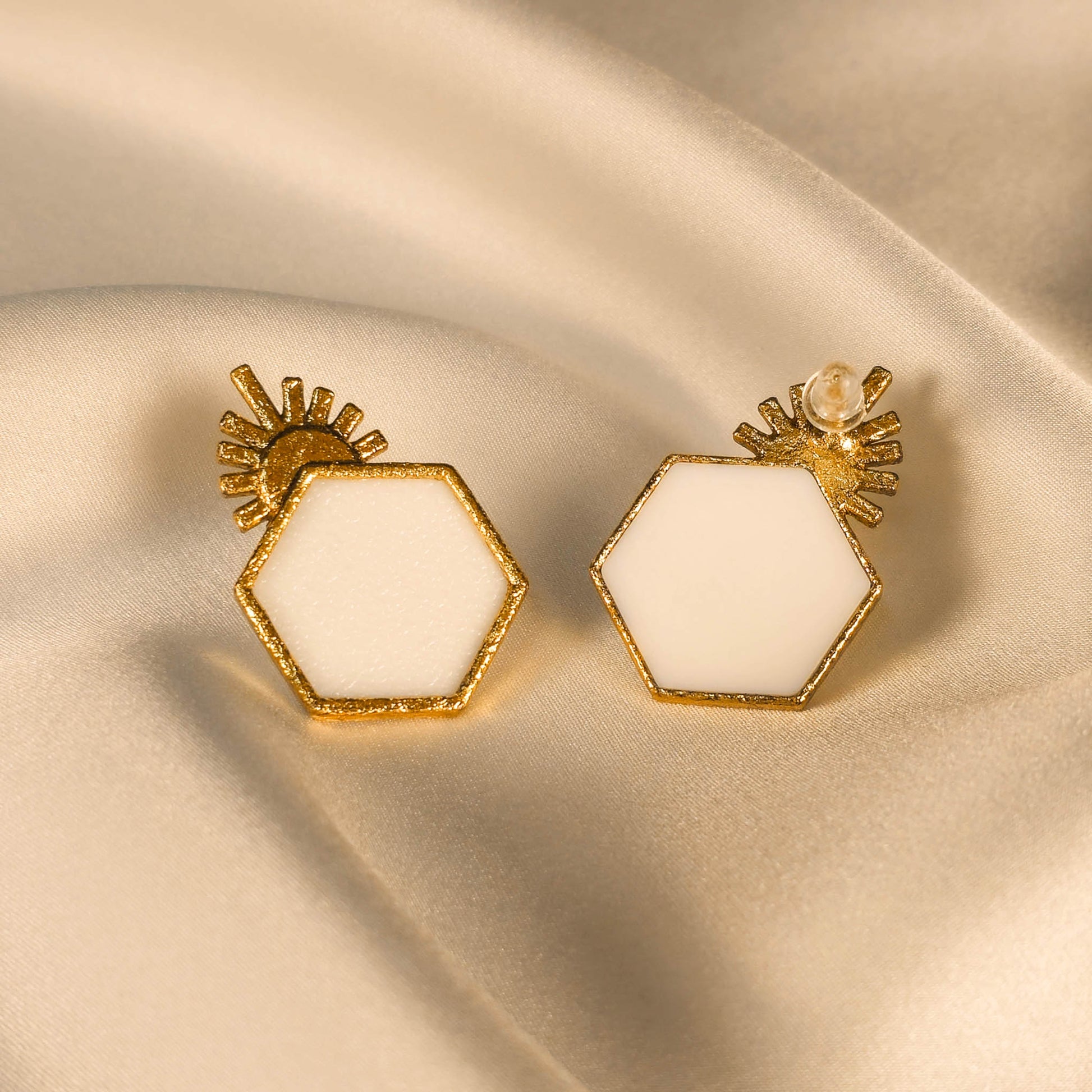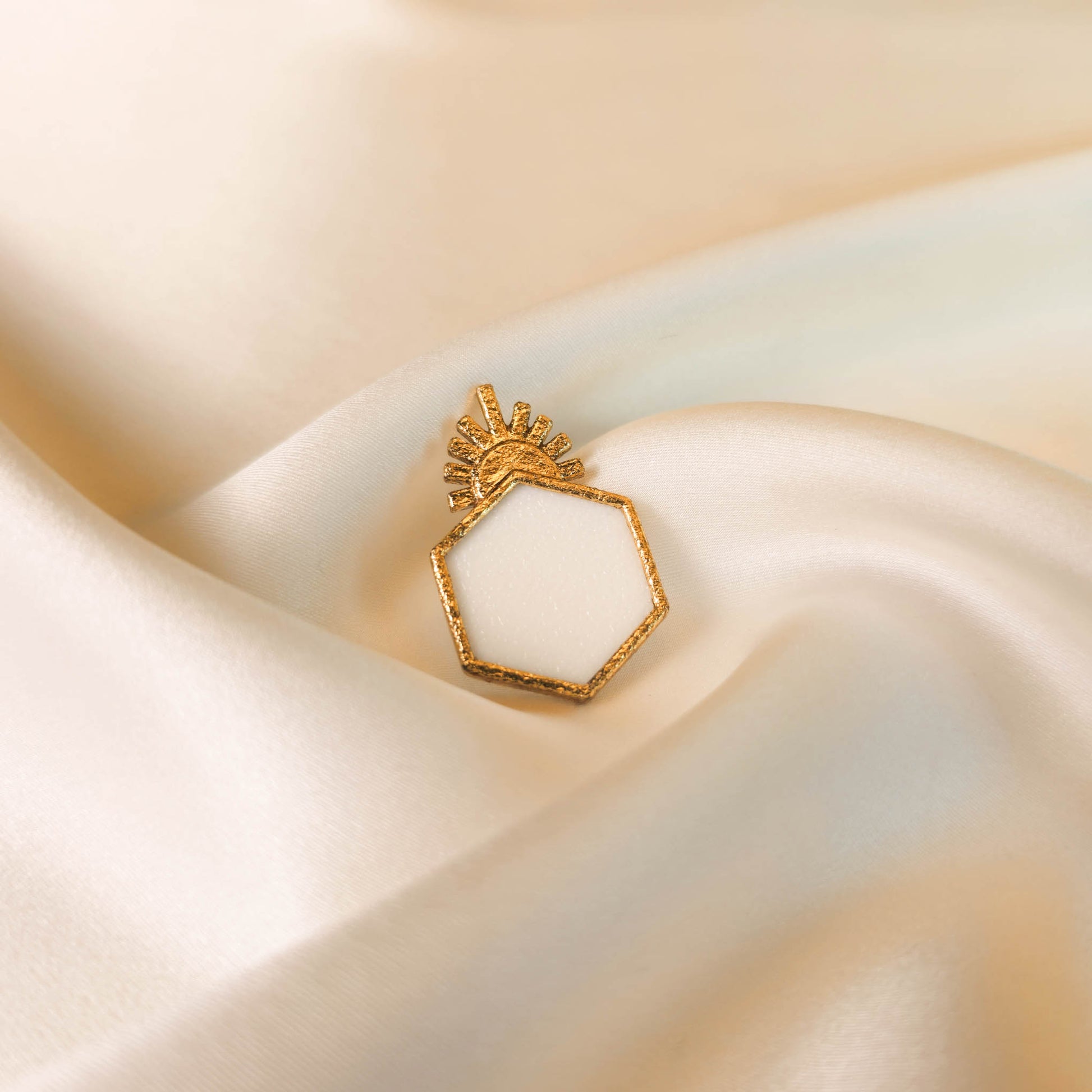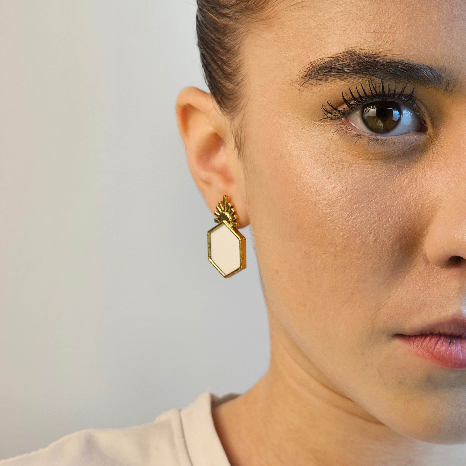 Ultra légère, l’Aube se pose sur le lobe comme une respiration, accompagnant chaque mouvement d’une clarté subtile. Sa surface nacrée reflète la lumière avec douceur, tandis que son contour doré affirme une élégance discrète.